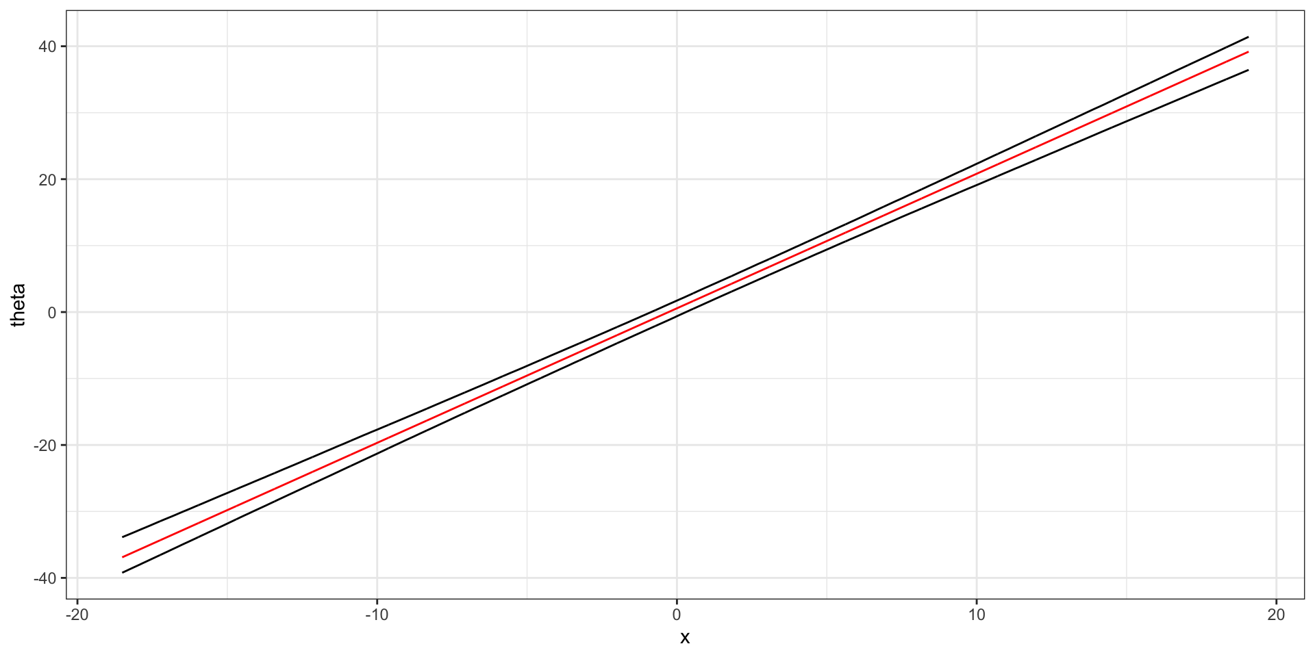 The red line shows our posterior expectation of \(\theta(x)\) for each \(x\). The black bands show our 95% confidence interval \(\theta(x)\).