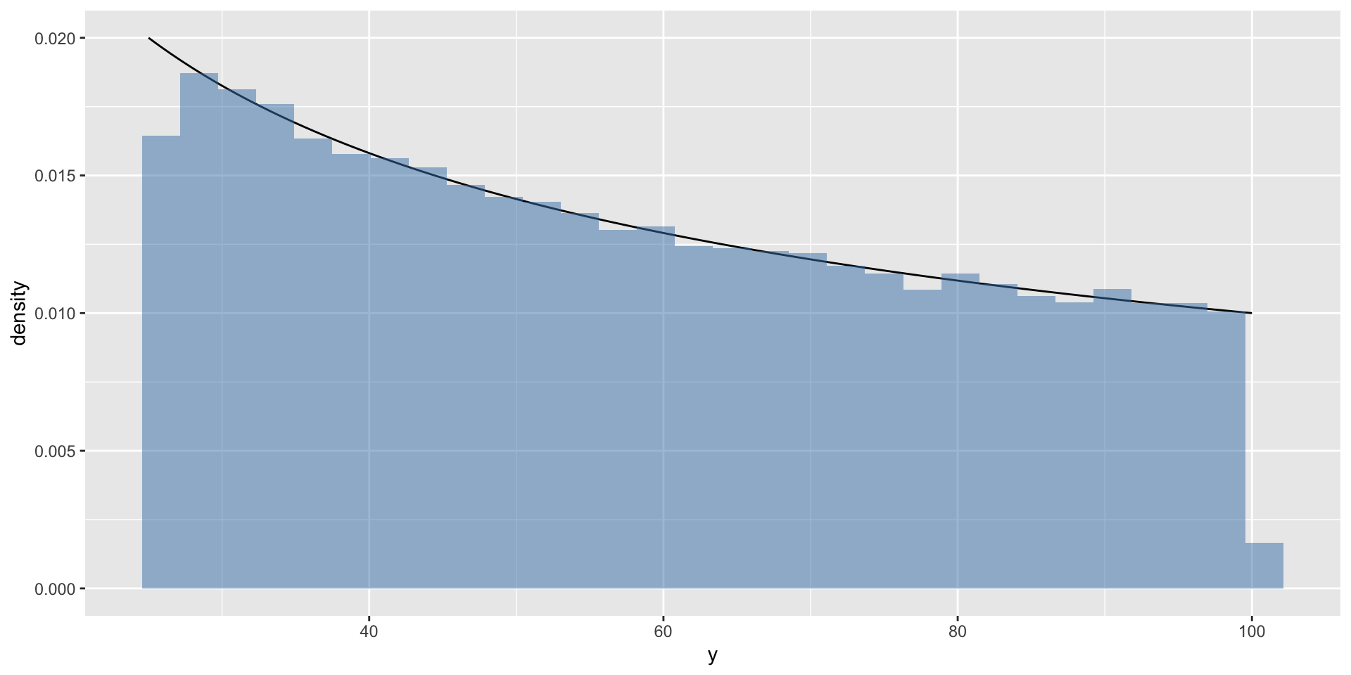 Exercise: use the change of variables formula to derive \(p(y)\). Confirm via simulation, as in exercise 2.