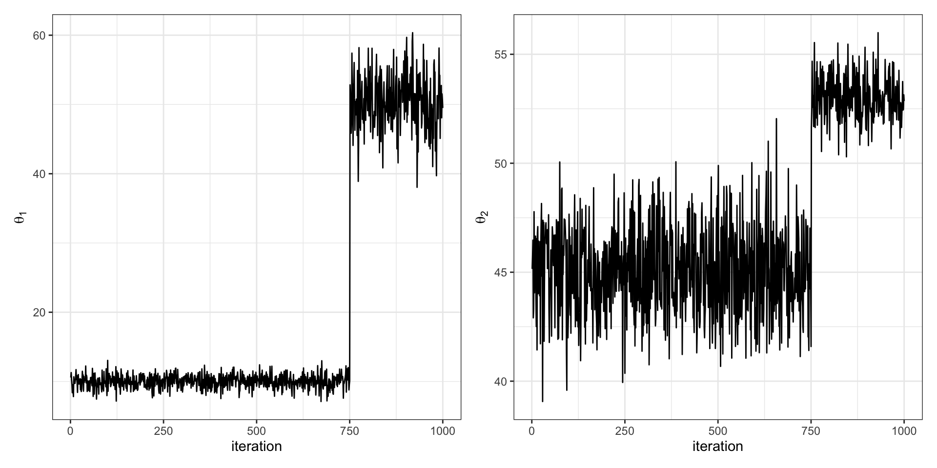 We construct a Gibbs sampler and look at the trace plots of \(\theta_1\) and \(\theta_2\), produced below. Chat with your neighbor, describe what you observe. Has the chain reached stationarity for each parameter? How well is the sampler mixing? Do you think the parameters are correlated or uncorrelated? Why or why not?