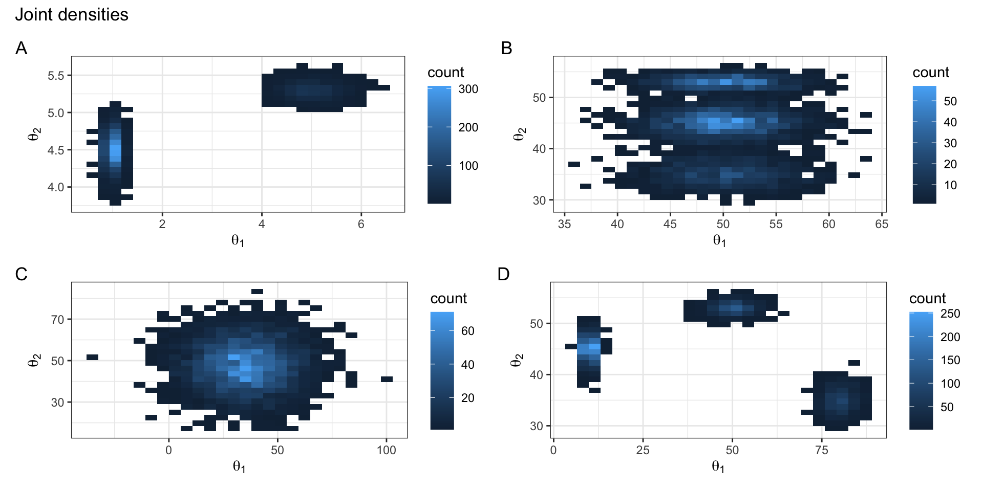 Based on the first 1000 iterations of your Gibbs sampler shown on the previous slide, which of the following joint densities is the most plausible for \(\theta_1, \theta_2 | \mathbf{y}\)? Why? Hint: it may help to think about where your sampler starts and imagine a particle moving through space according to conditional updates.